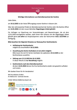 Bitte geben Sie Ihren Kollegen die entweder dauerkrank oder nur temporär die Kantine nutzen Bescheid, das Sie Ihr Guthaben bis Spätestens 19.12.2025 an der Kasse auszahlen.